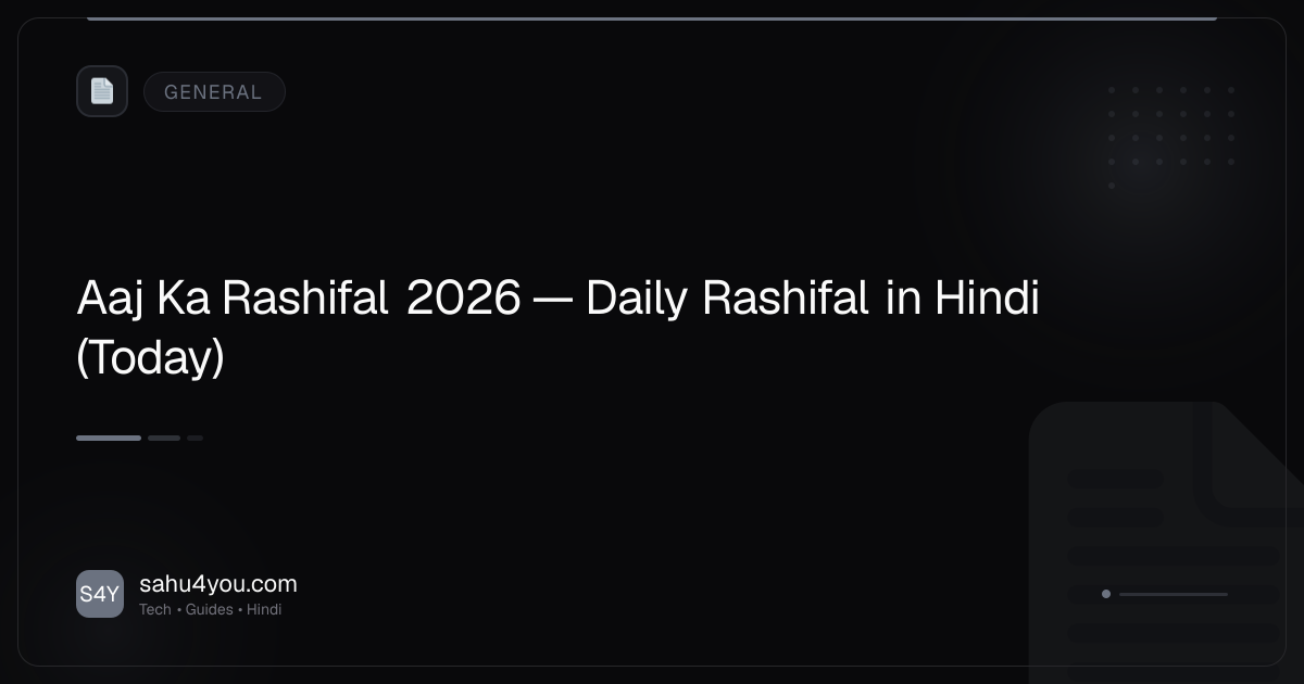 अगर आप अपनी कुंडली विस्तार से समझना चाहते हैं, तो कुंडली मिलान और वास्तु गाइड पढ़ें। Daily horoscope की पूरी गाइड के लिए Daily Horoscope In Hindi देखें। Aaj ka rashi kya hai और rashi walon ka aaj ka din kaisa rahega — इन सवालों का जवाब Sahu4You पर हर सुबह मिलता है। कल का राशिफल पढ़ने के लिए हमारे ब्लॉग पर वापस आएं।